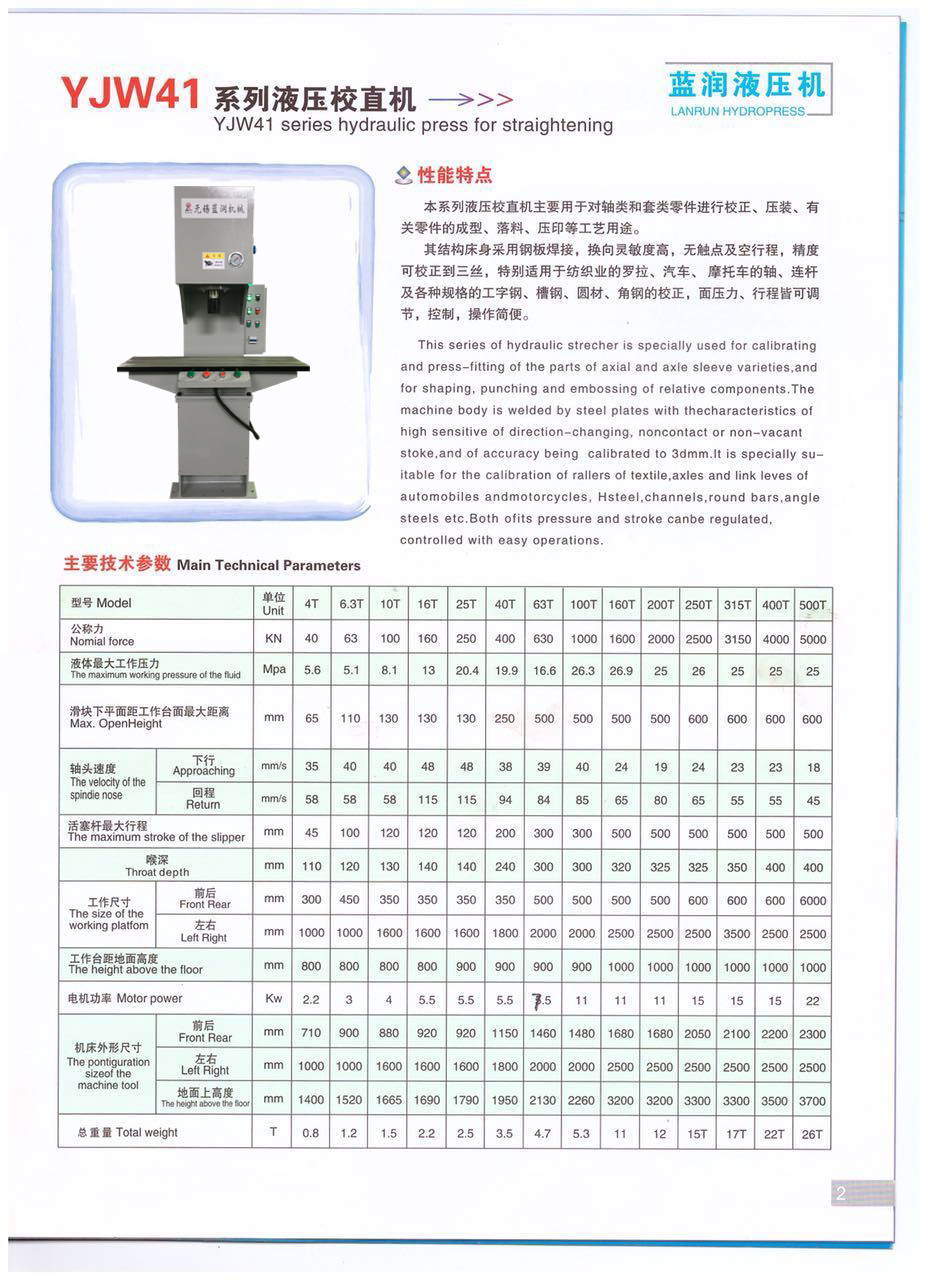 無錫藍潤機械是一家集生產和銷售單柱液壓機、龍門液壓機、液壓校直機、自動校直機等各類型號的專業(yè)液壓機制造商,液壓機產品遠銷國內外,質優(yōu)價廉,品種齊全,受到廣大客戶的好評。