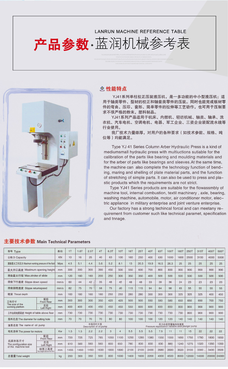 無錫藍潤機械是一家集生產(chǎn)和銷售單柱液壓機、龍門液壓機、液壓校直機、自動校直機等各類型號的專業(yè)液壓機制造商,液壓機產(chǎn)品遠銷國內(nèi)外,質(zhì)優(yōu)價廉,品種齊全,受到廣大客戶的好評。